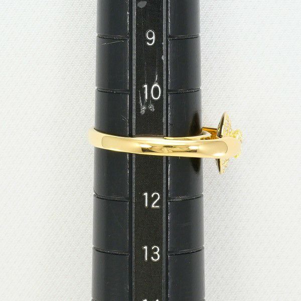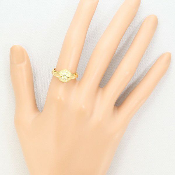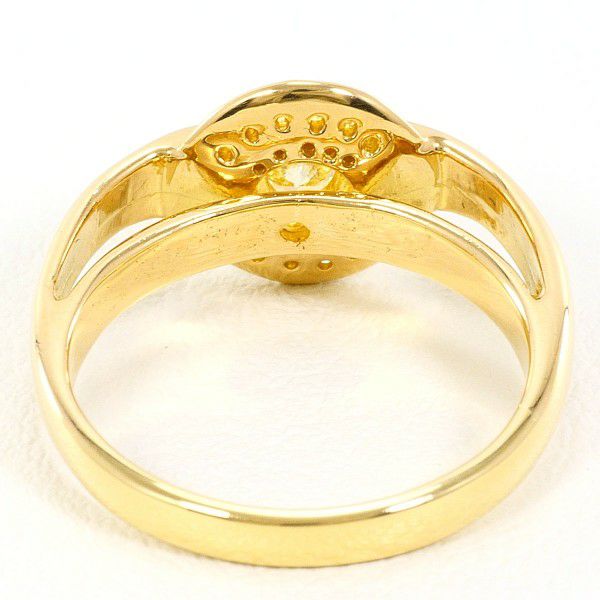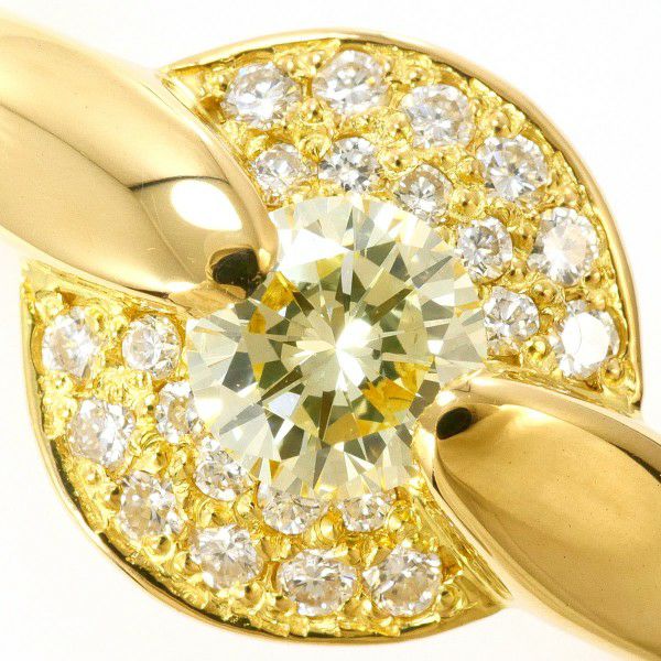 このリングは、優雅さと存在感を見事に兼ね備えた一点です。中心に配された淡いイエローカラーのダイヤモンドが、上質な輝きを放ちながら指元を華やかに彩ります。周囲を取り囲むメレダイヤとの調和も美しく、ゴールドの温かな色合いが全体をより上品に引き立てています。