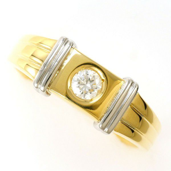 力強さと上質感を兼ね備えた、存在感のあるリングです。イエローゴールドとプラチナのコンビネーションが洗練された印象を生み、中央にセットされたダイヤモンドが上品に輝きます。直線的なラインと重厚なフォルムが絶妙に調和し、身に着けるだけで品格を高めてくれる一本です。