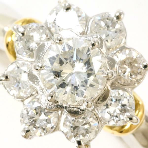 ラウンドブリリアントカットの天然ダイヤモンドを中心に、周囲を小粒のダイヤモンドが取り囲む華やかなデザインのリングです。中央石はGカラー、クラリティI-1、カットグレードGoodの輝きを持ち、プラチナ素材の台座がその透明感を引き立て、フォーマルな印象を与える上品なジュエリーです。