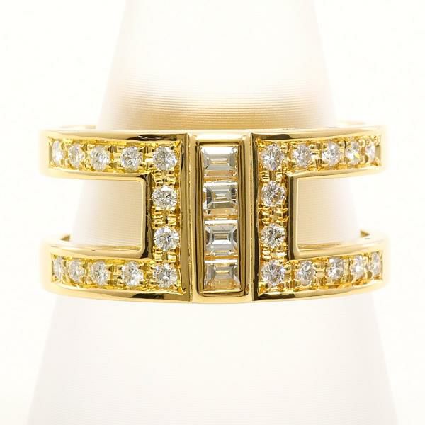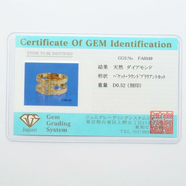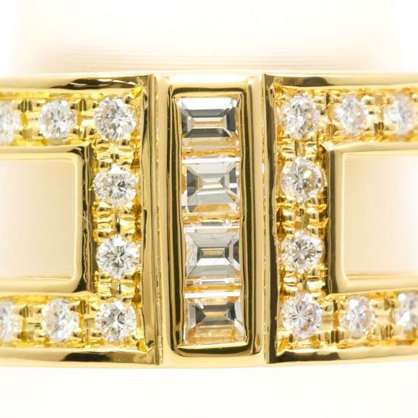 精緻に配置されたバゲットカットとラウンドブリリアントカットの天然ダイヤモンドが、美しい調和を生み出しています。直線的なデザインの中に繊細な輝きが際立ち、重厚感のあるゴールドとダイヤモンドの透明感が見事に融合した、完成度の高いリングです。