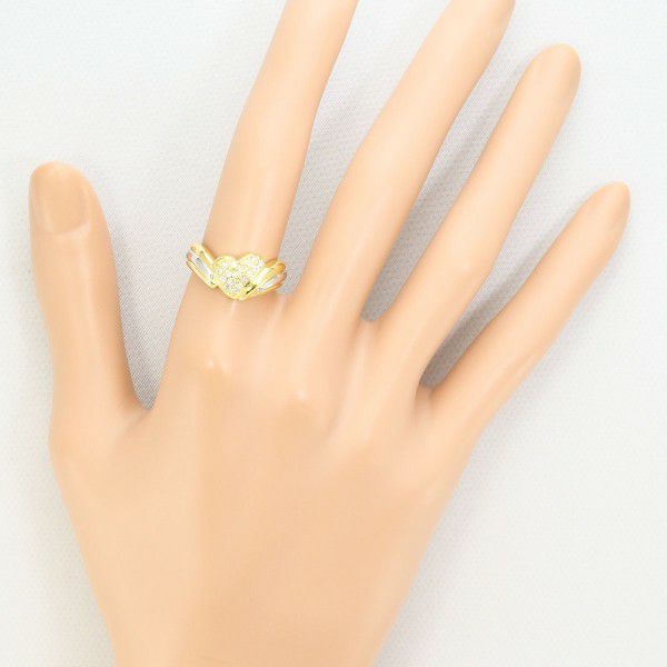 洗練されたデザインが魅力のイエローゴールドリングです。中央には繊細に並べられたダイヤモンドが美しい輝きを放ち、上質な仕上がりを際立たせています。流れるようなフォルムが指元に優雅な印象を与え、高級感を引き立てています。