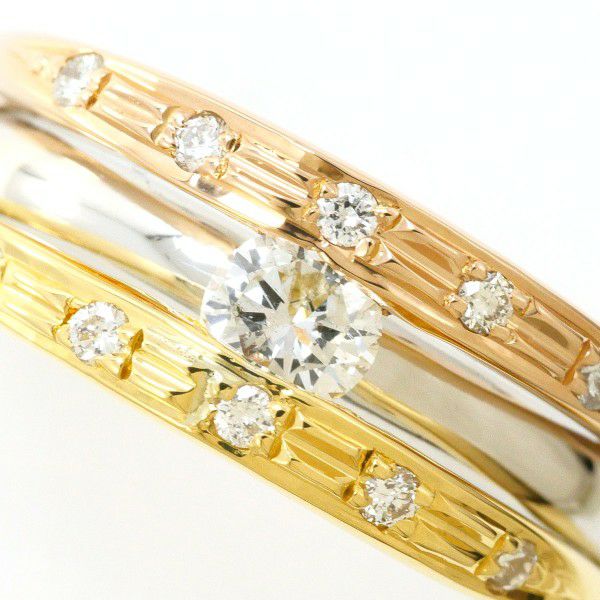 プラチナと2色のゴールドが織りなす洗練のハーモニー。中央に輝くラウンドブリリアントカットダイヤモンドが、気品と華やぎを添えます。繊細なデザインの中に力強さが宿る、個性と美しさを兼ね備えた逸品です。見るたびに心ときめく、大人のための特別なリングです。