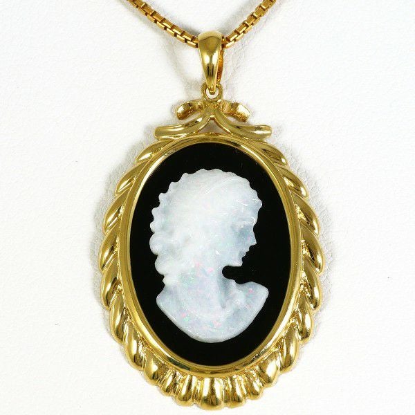 天然オパールとオニキスを用いたK18カメオペンダントです。オパールの彫刻が優美な横顔を描き、黒のオニキスがその美しさを際立たせます。繊細な金の縁取りが品格を添える、クラシカルな魅力に満ちた逸品です。