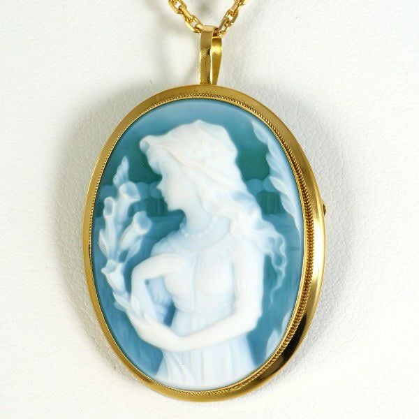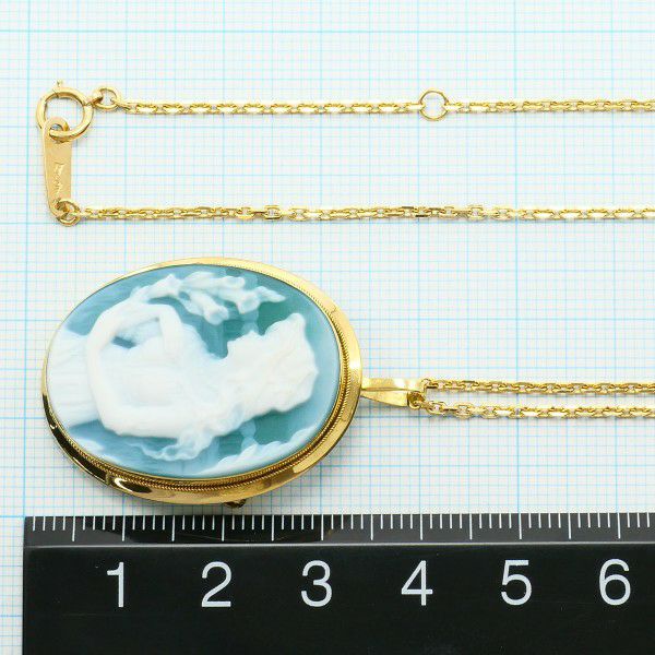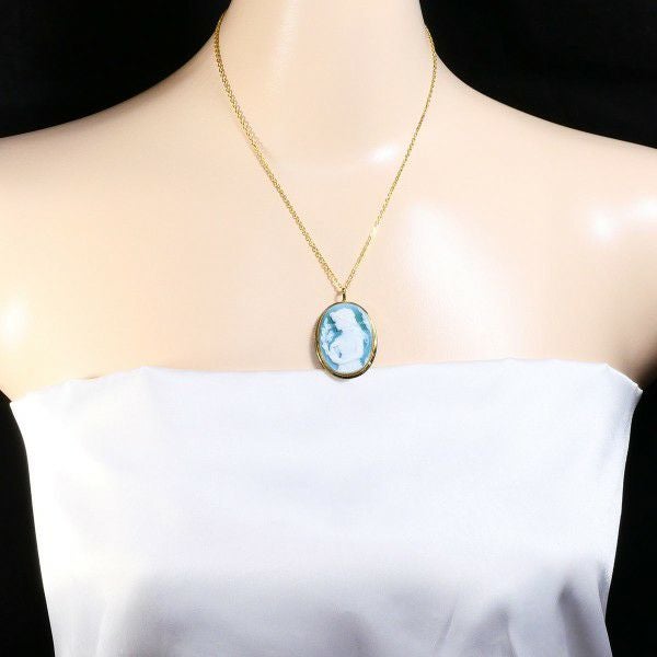 天然アゲートを用いたクラシカルなカメオペンダントです。柔らかなブルーとホワイトのグラデーションが美しく、女性像の繊細な彫刻が際立ちます。K18イエローゴールドのフレームが温もりを添え、上品で気品ある印象を演出し、落ち着いた色合いと優美なデザインが胸元を優しく彩る、永く愛用できる逸品です。