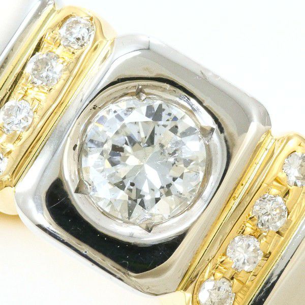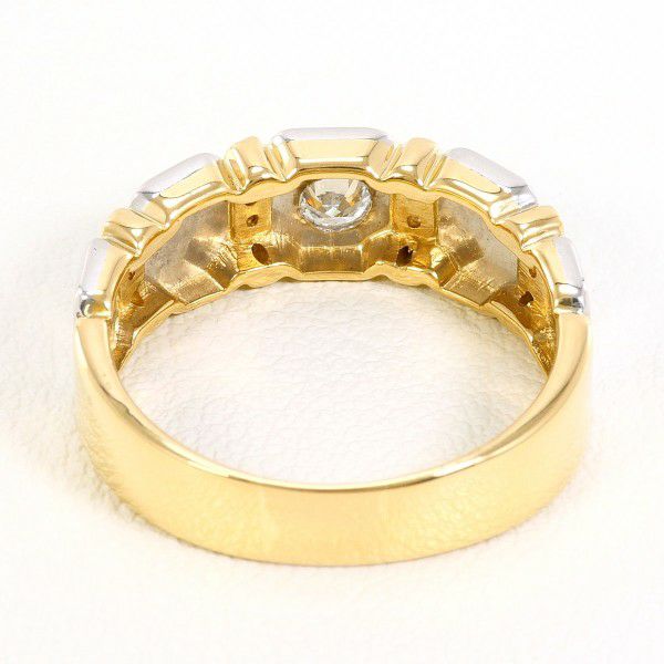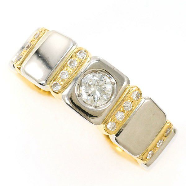 プラチナとゴールドのコントラストが美しく、1本で存在感があります。センターのダイヤモンドがしっかりとした光を捉え、周囲のメレダイヤと共に上品な輝きを演出しています。立体感のあるブロック調のフォルムが程よいボリュームを与え、クラシックさとモダンさが両立したリングとなっています。