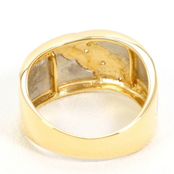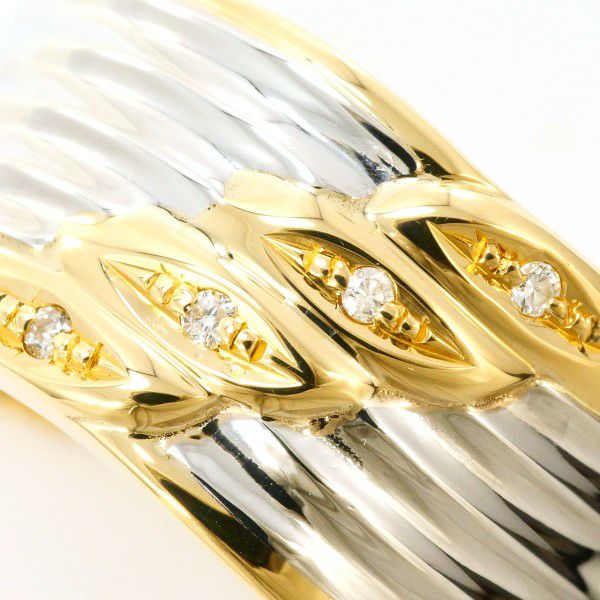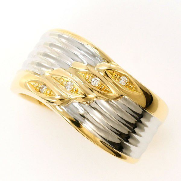幅のあるプラチナとイエローゴールドの地金に、天然ダイヤモンドをあしらったリング。緩やかな曲線が手元にモードな印象を添え、ラウンドブリリアントカットのダイヤが控えめに輝く、洗練されたデザインです。