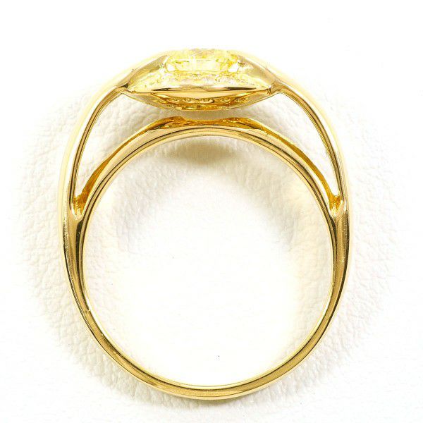 このリングは、優雅さと存在感を見事に兼ね備えた一点です。中心に配された淡いイエローカラーのダイヤモンドが、上質な輝きを放ちながら指元を華やかに彩ります。周囲を取り囲むメレダイヤとの調和も美しく、ゴールドの温かな色合いが全体をより上品に引き立てています。