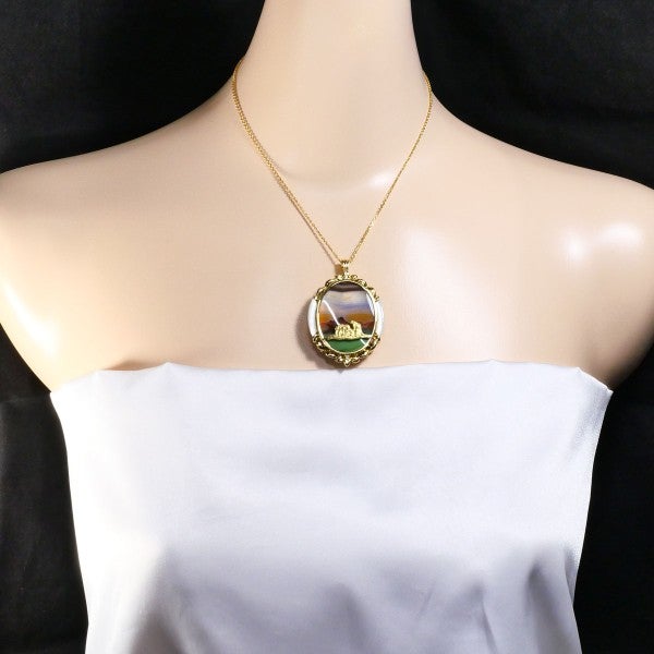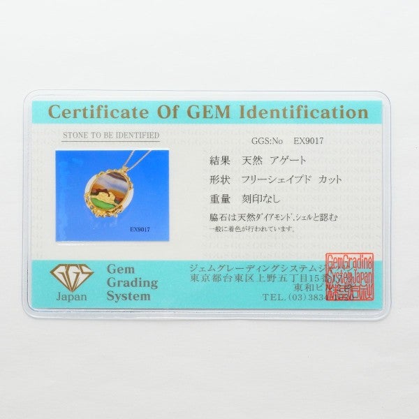 まるで物語の一場面を閉じ込めたかのような、幻想的なアゲートのネックレス。幾重にも重なる自然の色彩が、まるで夕暮れに染まる大地を思わせ、中央のゴールドのモチーフがそこに息づく生命を語るようです。シェルとダイヤの脇石が両脇を優しく飾り、全体に優雅で神秘的な美しさを添えています。