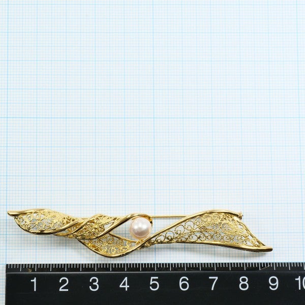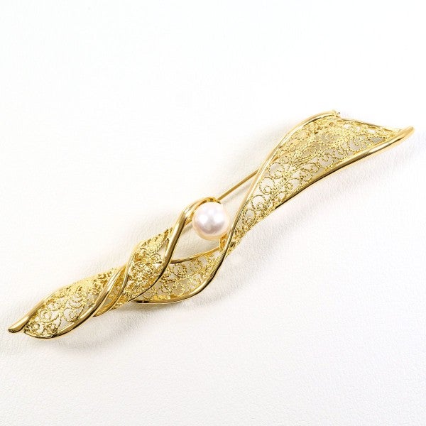 優雅な曲線を描くゴールドの透かし細工に、アコヤ真珠の上品な輝きが調和したブローチです。繊細な金細工の煌めきと、真珠の柔らかな光沢が重なり合い、気品ある美しさを放っています。装う人の雰囲気を一層高める、洗練された逸品です。