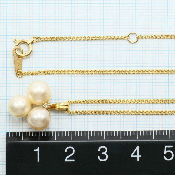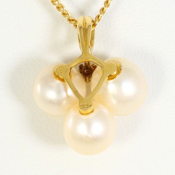 アコヤ真珠を3粒あしらったK18イエローゴールドのペンダントネックレスです。オフラウンドシェイプの真珠が柔らかな光沢を放ち、胸元に上品な華やかさを添えます。バランスよく配置された真珠の下には天然ダイヤモンドが輝き、シンプルでありながら気品漂う、美しいデザインのジュエリーです。
