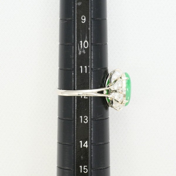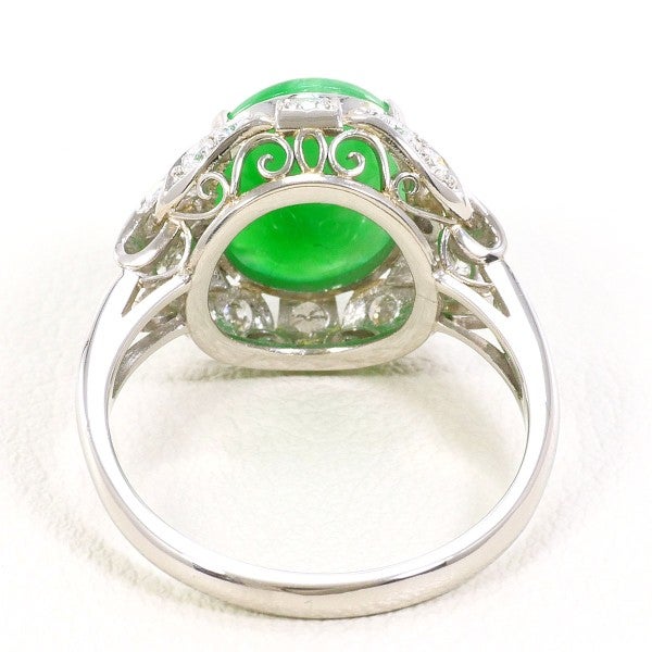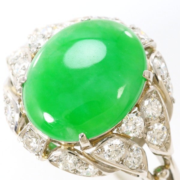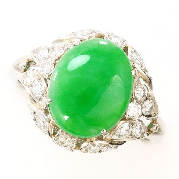 カボションカットならではの、なめらかな丸みと奥行きのある発色が美しく、翡翠特有の落ち着きと高級感をしっかり感じられます。周囲にセッティングされた天然ダイヤモンドが、翡翠の緑を引き立て、指元を明るく上品に演出します。