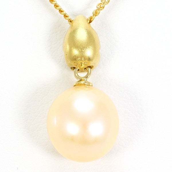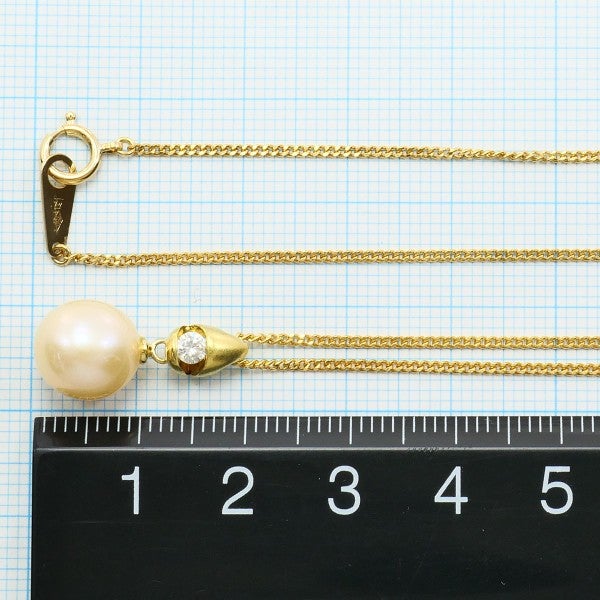 セミラウンドシェイプの真珠を中心に、上部に天然ダイヤモンドを配したペンダント。イエローゴールドの金具とチェーンが真珠の色味を引き立て、胸元に上質な存在感を添えます。フォーマルにも馴染む洗練された一本です。