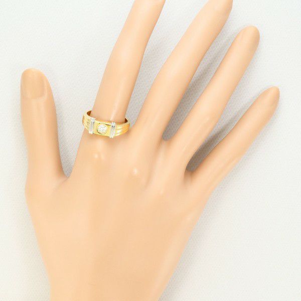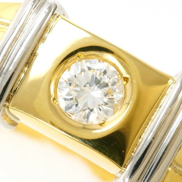 力強さと上質感を兼ね備えた、存在感のあるリングです。イエローゴールドとプラチナのコンビネーションが洗練された印象を生み、中央にセットされたダイヤモンドが上品に輝きます。直線的なラインと重厚なフォルムが絶妙に調和し、身に着けるだけで品格を高めてくれる一本です。