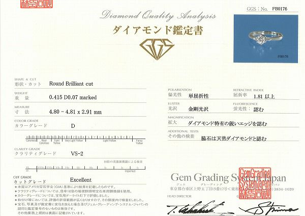 クラリティー:VS2 カラー:D カット:Excellent